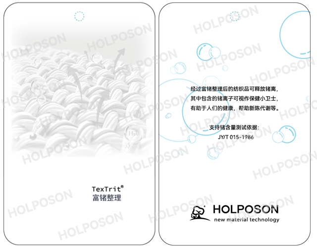富锗整理剂HOLPOSON®GE是本公司采用微胶囊技术制成的功能型整理剂,后整理高温定型能使富锗整理剂HOLPOSON®GE牢固的结合在纺织品上,使其具有持久的释放功能。